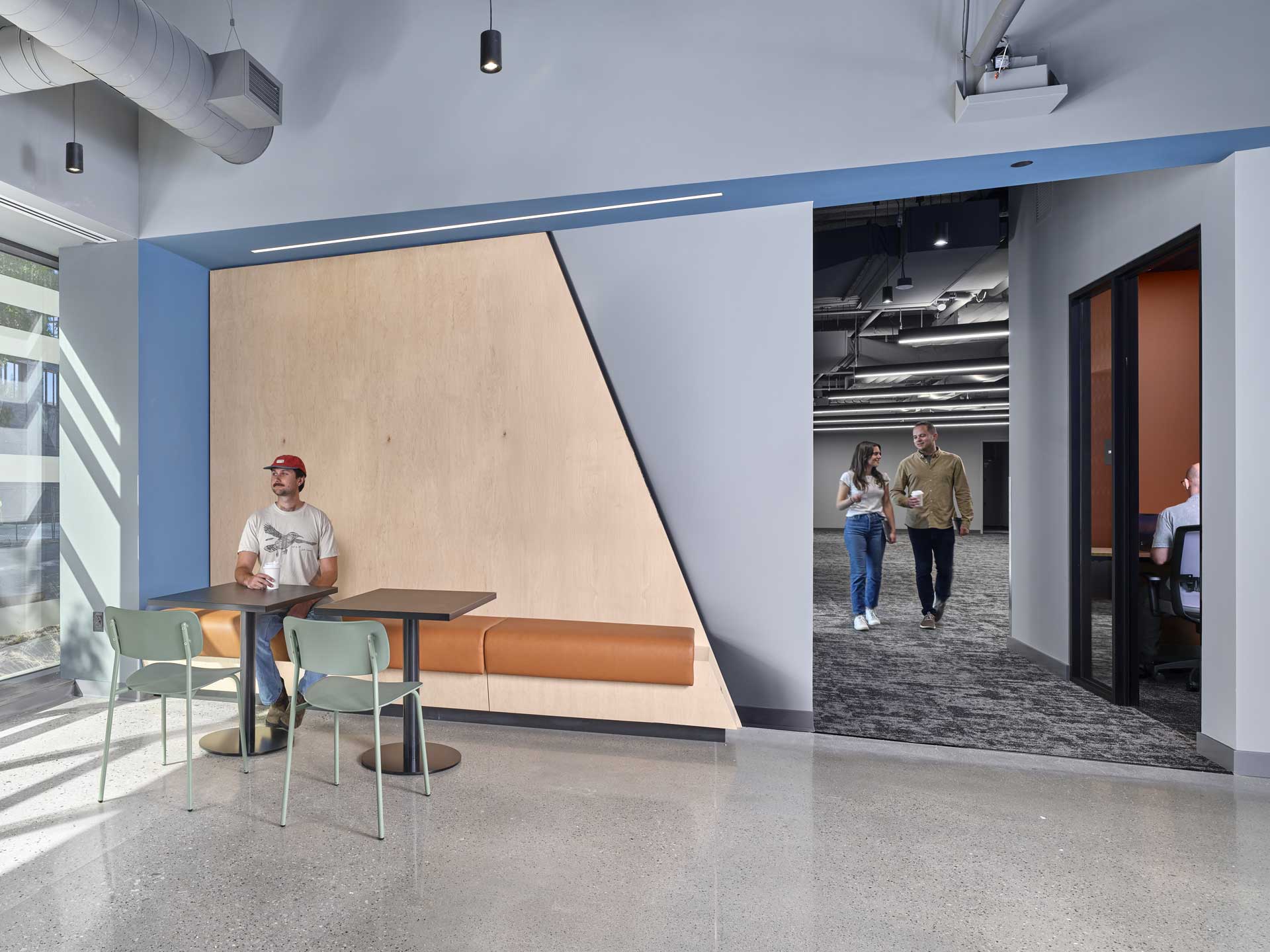 Ghost Robotics’ brand identity informed every design decision. Taking cues from their robots’ ability to navigate irregular terrain, angled walls, tiered ceiling forms and sharply detailed millwork suggest constant motion. Branded blue “slices” run through key architectural elements, and LED-backlit metal signage delivers a bold sense of arrival. Digital screens and precision lighting are built into plywood feature walls, blending material craft and tech. Polished concrete flooring offers a durable surface fit for robotic testing. Cork-textured walls in the boardroom subtly evoke a natural landscape while adding warmth and acoustic control.