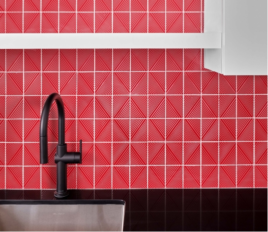 Materiality balances richness and restraint. The reception desk’s black textured stone and white acrylic detail establish a clear graphic language, while walnut introduces warmth. Hardware in dark bronze and black unifies new millwork and glass doors and respects existing brass in select private and support spaces. In the hub and café, a bold red glossy backsplash plays against white uppers, dark base cabinets, and a black stone countertop. White and black furniture sits on wood-look flooring, with a tailored geometric banquette back that mixes shades of red with lighter warm tones. The composition ties back to legacy elements while advancing the firm’s contemporary voice.