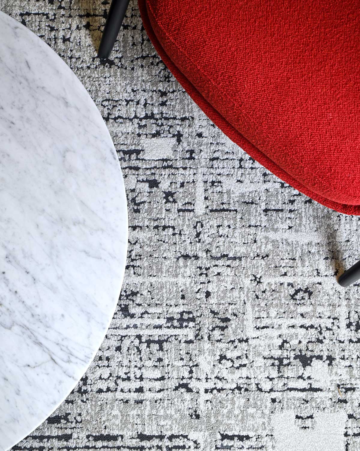 SGRV’s bold personality is present throughout the finish palette. Sculptural lounge seating in cherry red anchors reception over a high contrast area rug. Dark, tailored wallcovering at the elevator lobby pairs with white wood trim, base, molding, and casings for a disciplined, gallery-like threshold. In private offices and open areas, a dark general carpet meets newly painted white walls and crisp linear lighting, producing a refined contrast that reads as deliberate and modern.